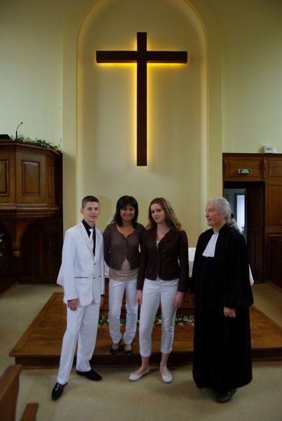 Confirmation et Baptême : 27 mai 2012 au Temple de ThannPierre, Lise et Laura avec le pasteur Françoise Gehenn