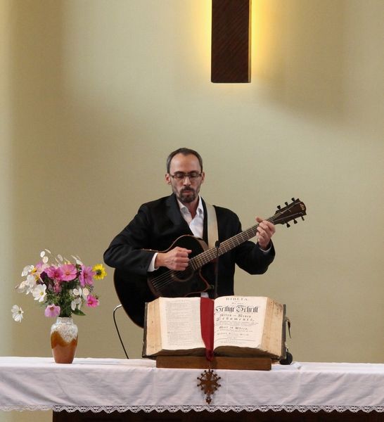 Le pasteur JN.Petit (pasteur de Guebwiller) accompagne un chant à la guitare